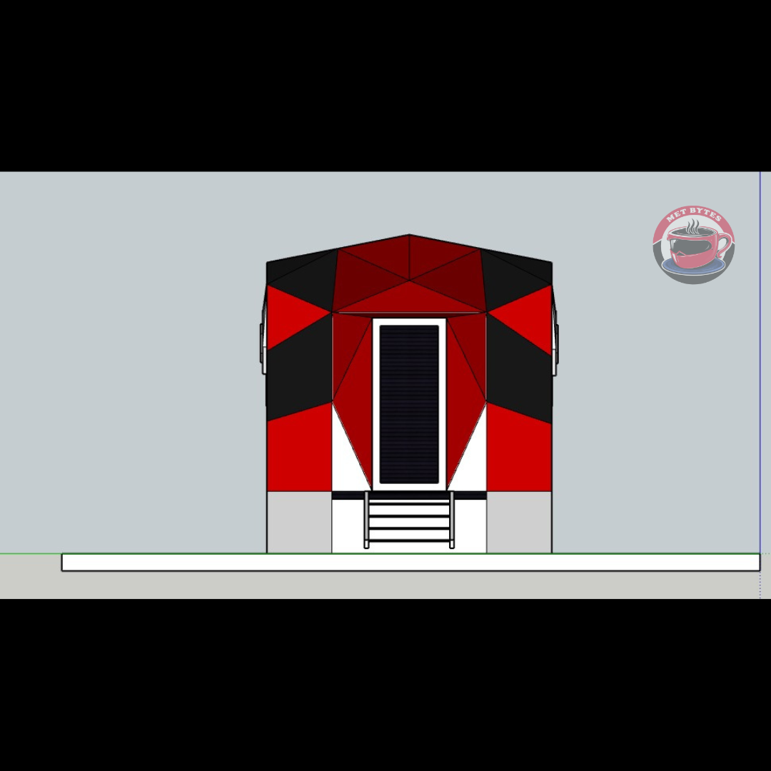 The Helmet Kiosk is designed as an architectural statement rather than a conventional stall. Its silhouette directly references a modern motorcycle helmet, with blue-tinted glazing functioning as the visor and vibrant multi-color graphics inspired by racing aesthetics.