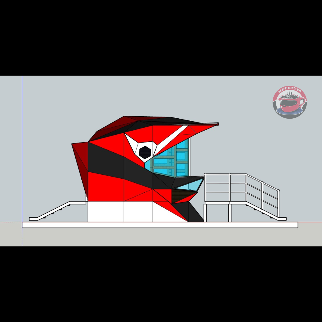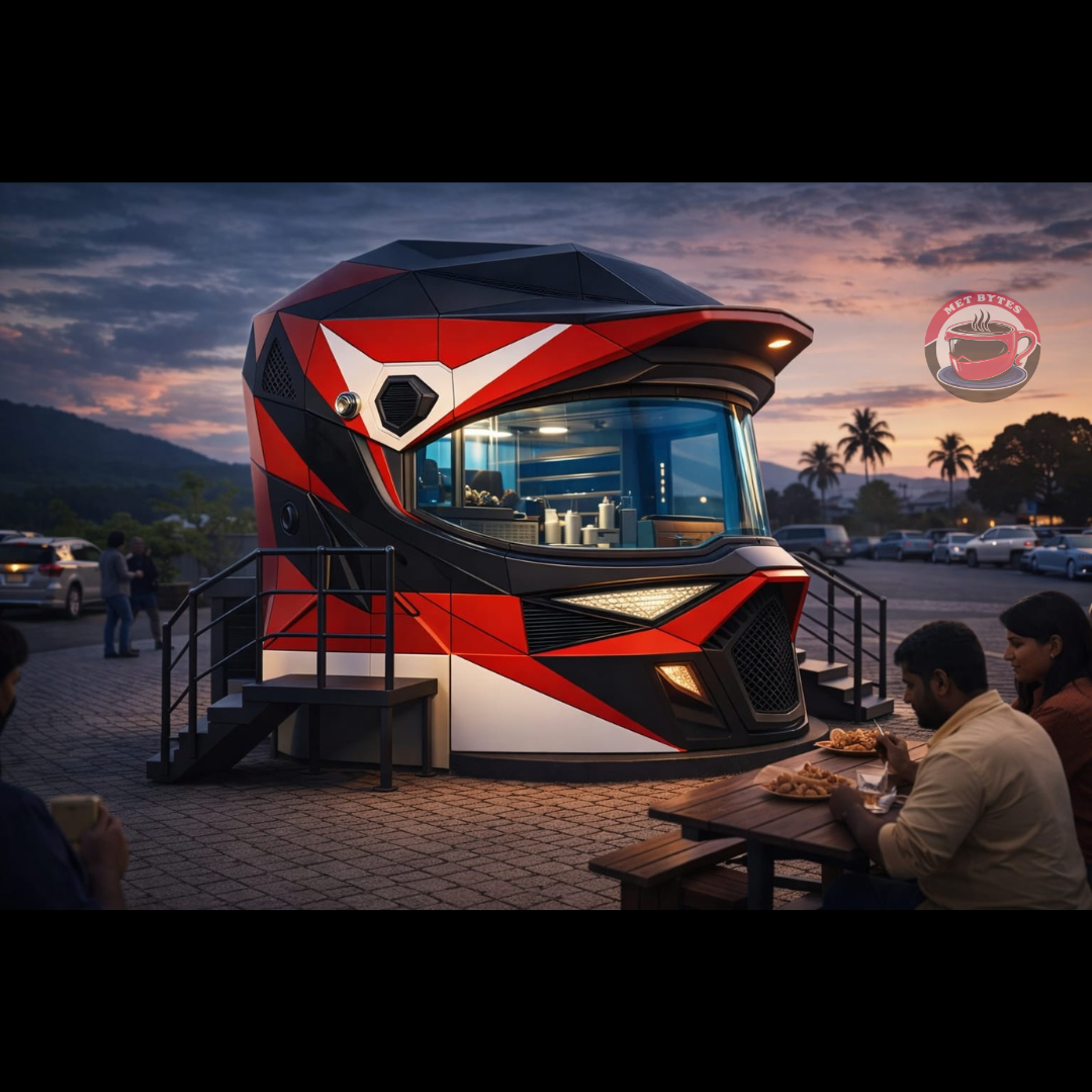The Helmet Kiosk is designed as an architectural statement rather than a conventional stall. Its silhouette directly references a modern motorcycle helmet, with blue-tinted glazing functioning as the visor and vibrant multi-color graphics inspired by racing aesthetics.